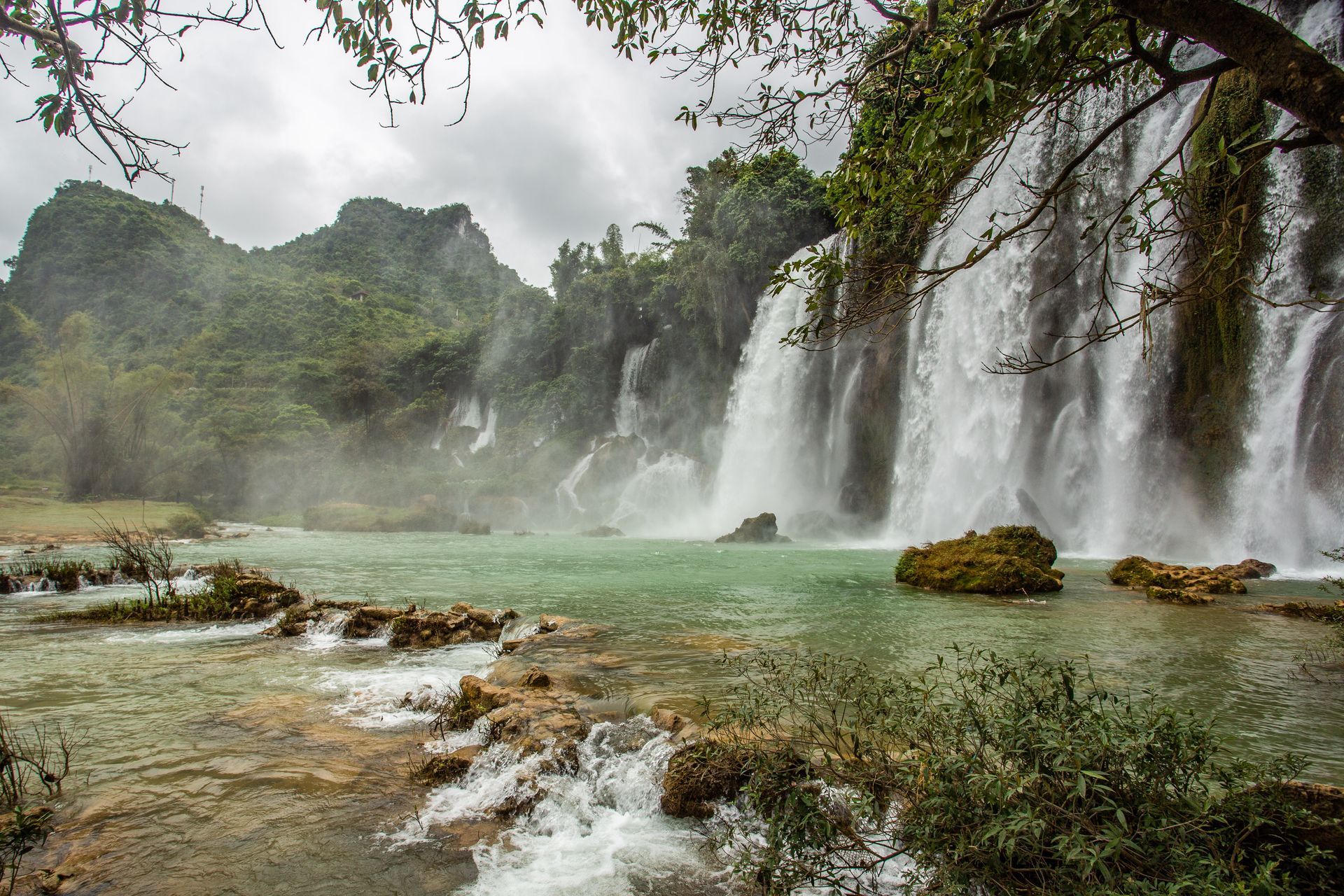 Die Weiterfahrt ging zum BAN GIOC Wasserfall. Wahrhaftige ein spektakulärer Wasserfall an der chinesischen Grenze. Über 30 m hoch und 300 m breit mit mehreren Kaskaden. Die Grenze zu China verläuft mitten im Fluss, von beiden Seiten kommen viele Touristenboote um diese Spektakel zu sehen.